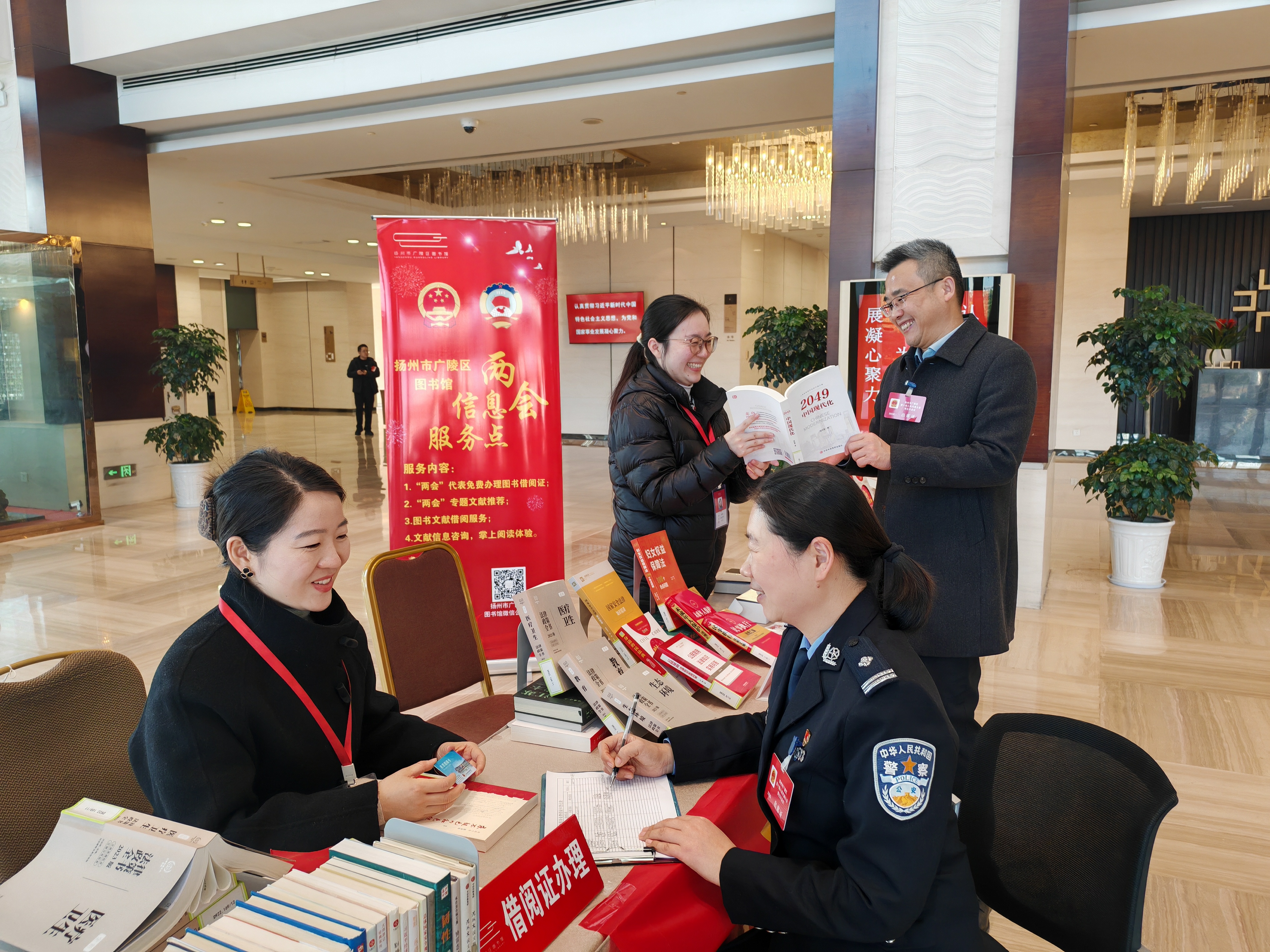 扬州市广陵区图书馆在区两会期间,为参会代表提供图书借阅、免费办证等贴心服务(扬州市广陵区人民代表大会常务委员会供图)